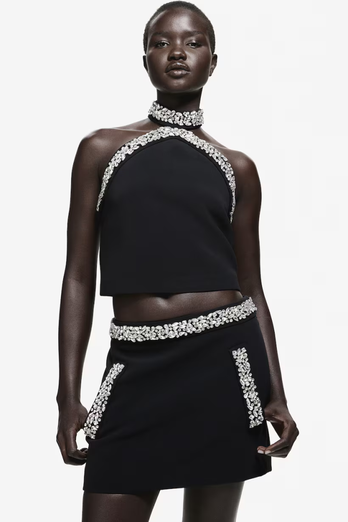 When paired with the Rhinestone-Embellished Mini Skirt, your look just gets even better. This skirt is perfect for when you want to keep things edgy and sleek. It has a subtle yet bold shine thanks to its rhinestone embellishments, giving it a sophisticated appeal that’s not too over the top. The mini skirt silhouette adds a fun vibe, while still being versatile enough to pair with everything from oversized sweaters to tucked-in turtlenecks. It’s the ideal piece to keep your legs warm without sacrificing style.